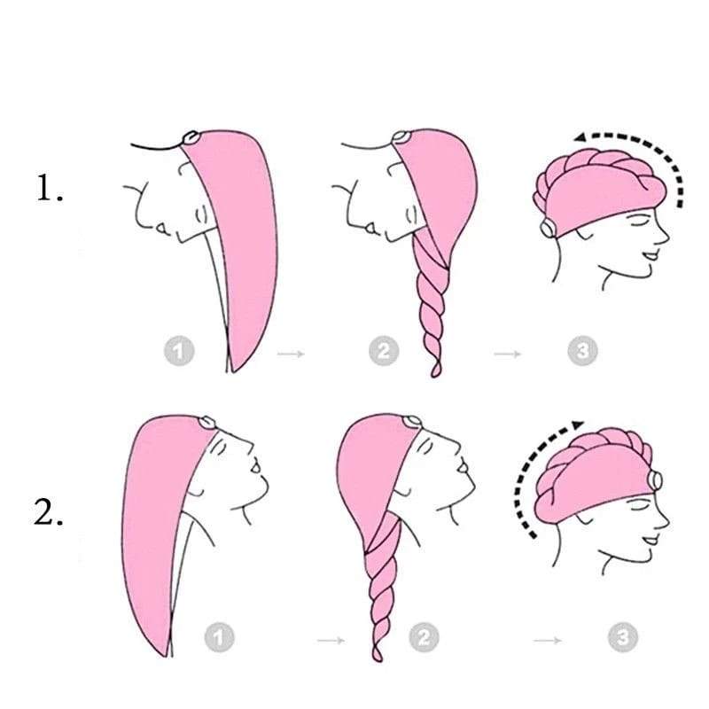1. Bend to make your hair hang down, put on hair towel on top of head (the end with button)